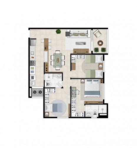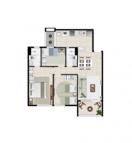 Torre 1: Apartamentos tipo A com metragem de 75,53m² de área privativa - Sala de Estar/Jantar, Varanda/Sacada, Cozinha, Área de