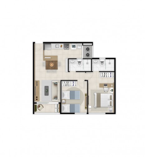 Torre 3: Apartamentos tipo C com metragem de 56.66m² de área privativa - Sala de Estar/Jantar, Varanda, Circulação, Cozinha,