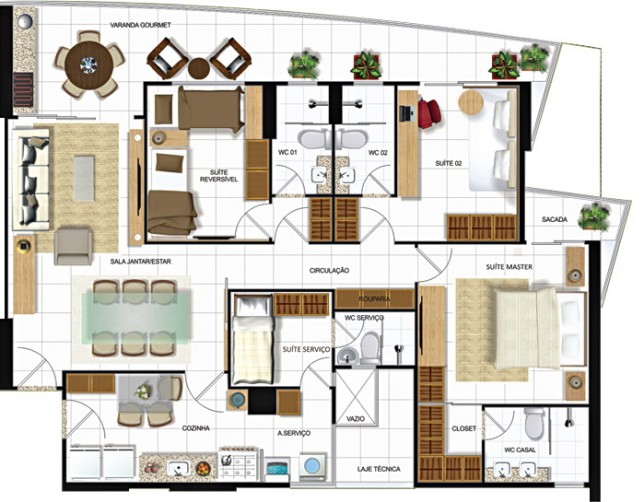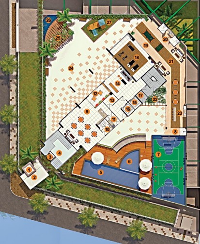 - Espaços para funcionários do condomínio: vestiário feminino, masculino e lavanderia de serviço
